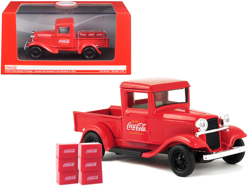 - Brand new 1/43 scale diecast car model of 1934 Ford Model A Pickup Truck Red with 6 Bottle Cartons “Coca-Cola” die cast model car by Motorcity Classics.