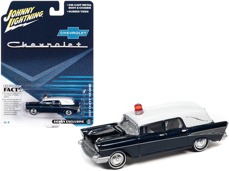 • Brand new 1/64 scale diecast car model of 1957 Chevrolet Hearse Metisse Blue Metallic with White Top die cast model car by Johnny Lightning.