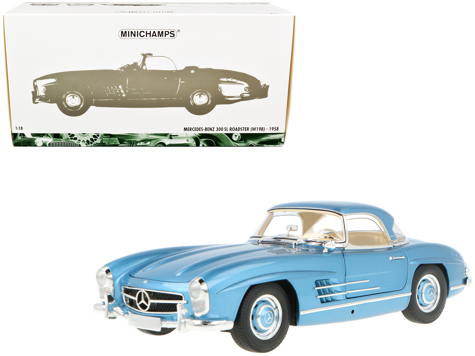 • Brand new 1/18 scale diecast car model of 1958 Mercedes-Benz 300 SL Roadster (W198) Blue Metallic die cast model car by Minichamps.