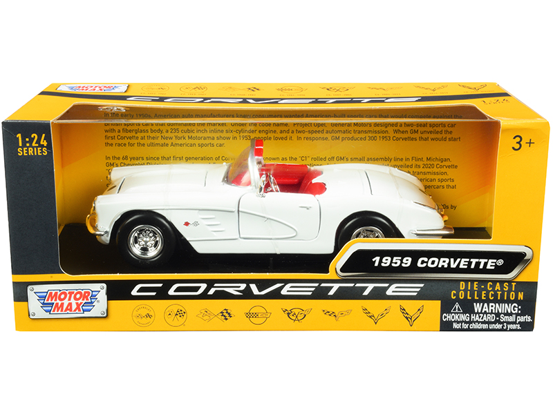 - Brand new 1/24 scale diecast car model of 1959 Chevrolet Corvette C1 Convertible White with Red Interior “History of Corvette” Series die cast model car by Motormax.