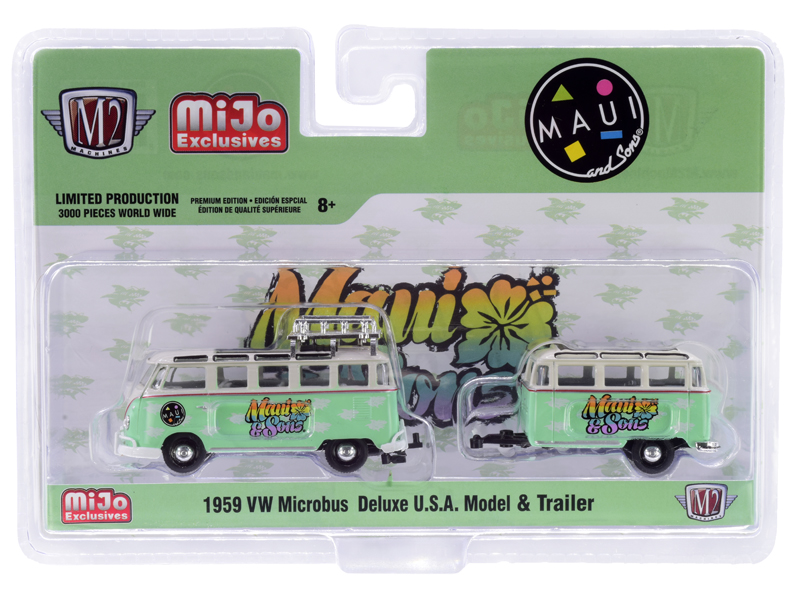 - Brand new 1/64 scale diecast model of 1959 Volkswagen Microbus Deluxe U.S.A. with Roof Rack with Travel Trailer Light Green and Cream “Maui and Sons” Limited Edition to 3,000 pieces Worldwide die cast model by M2 Machines.