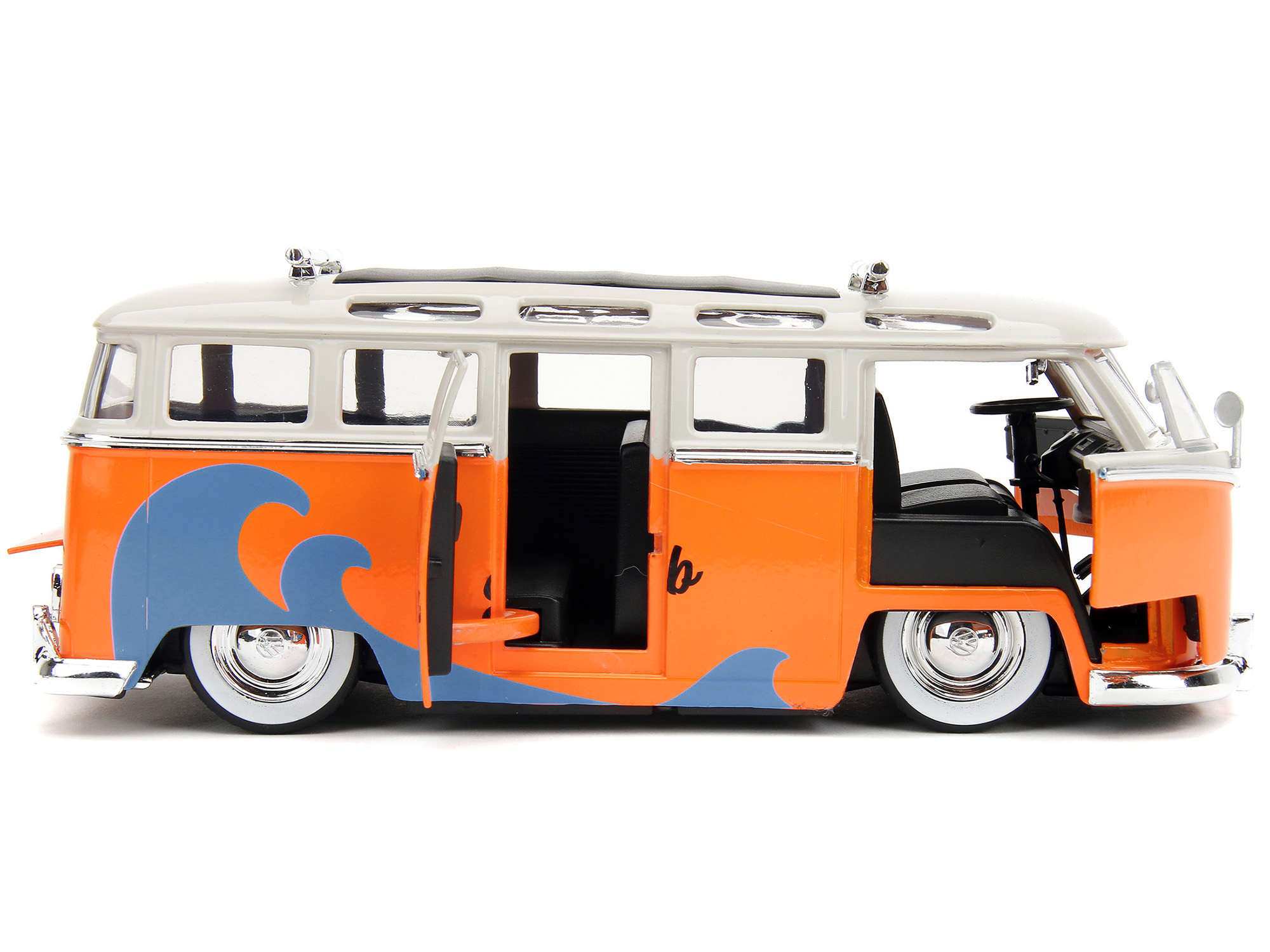 • Brand new 1/24 scale diecast car model of 1962 Volkswagen Bus “Santa Monica Surf Club” Orange and White with Graphics with Roof Rack and Surfboard “Punch Buggy” Series die cast model car by Jada.