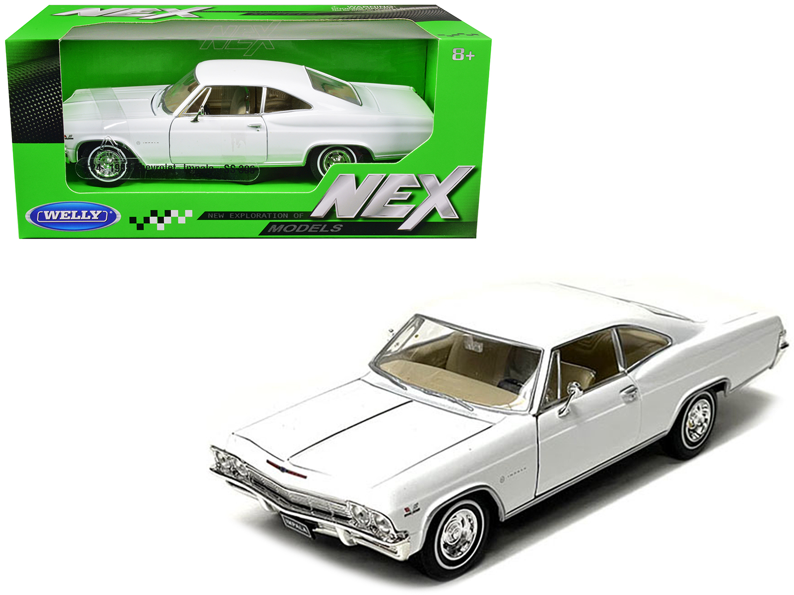 - Brand new 1/24 scale diecast car model of 1965 Chevrolet Impala SS 396 White “NEX Models” die cast model car by Welly.