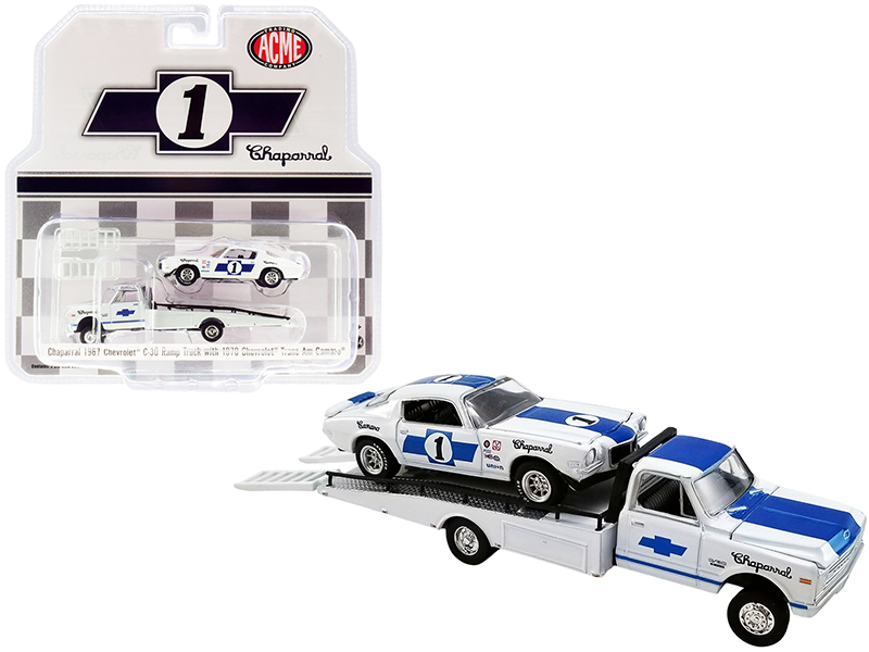 1967 Chevrolet C-30 Ramp Truck with 1970 Chevrolet Trans Am Camaro #1 White with Blue Stripes “Chaparral” “Acme Exclusive”