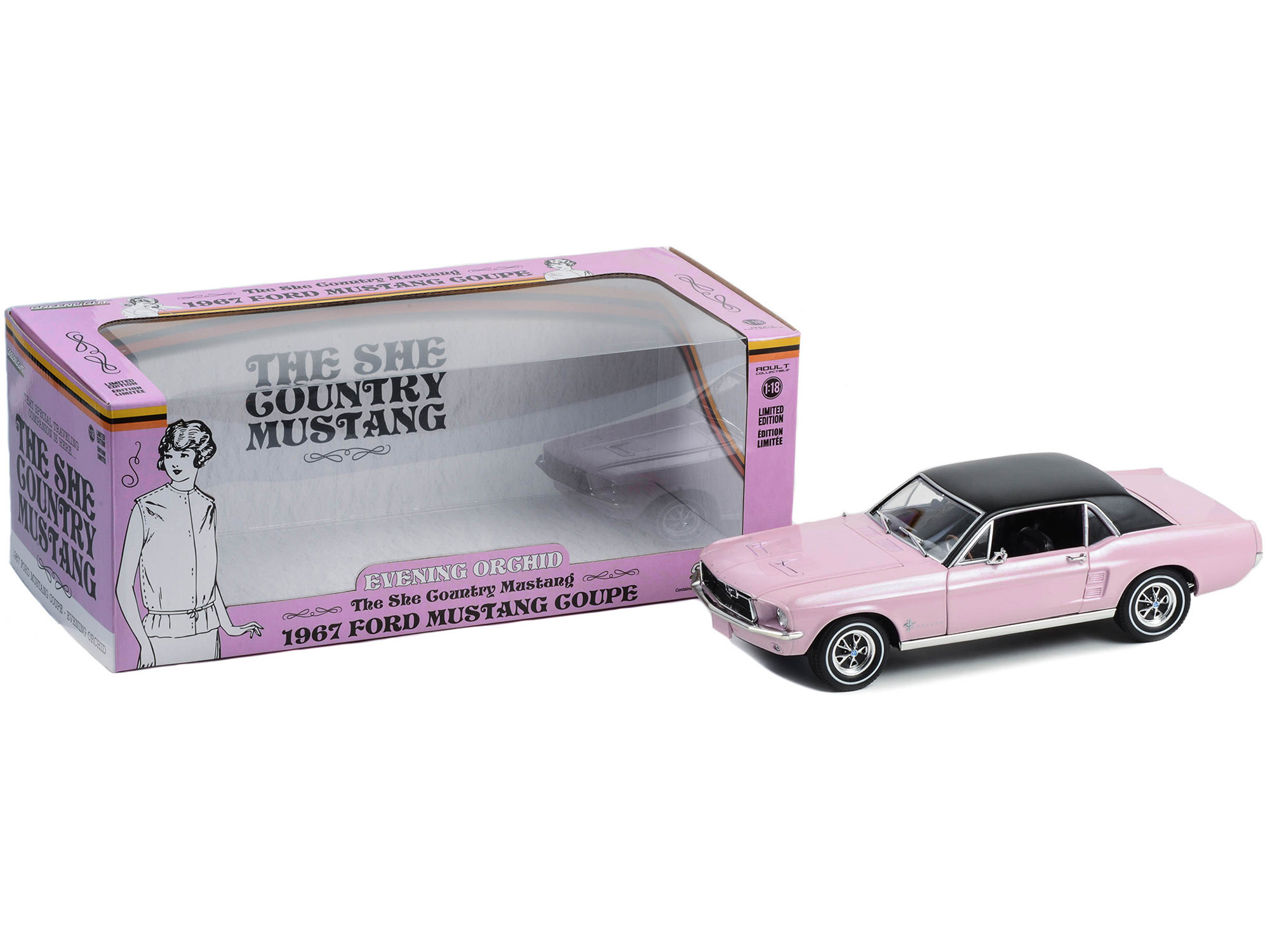 • Brand new 1/18 scale diecast car model of 1967 Ford Mustang Coupe Evening Orchid Pink Metallic with Black Top “She Country Special – Bill Goodro Ford, Denver, Colorado” die cast model car by Greenlight.