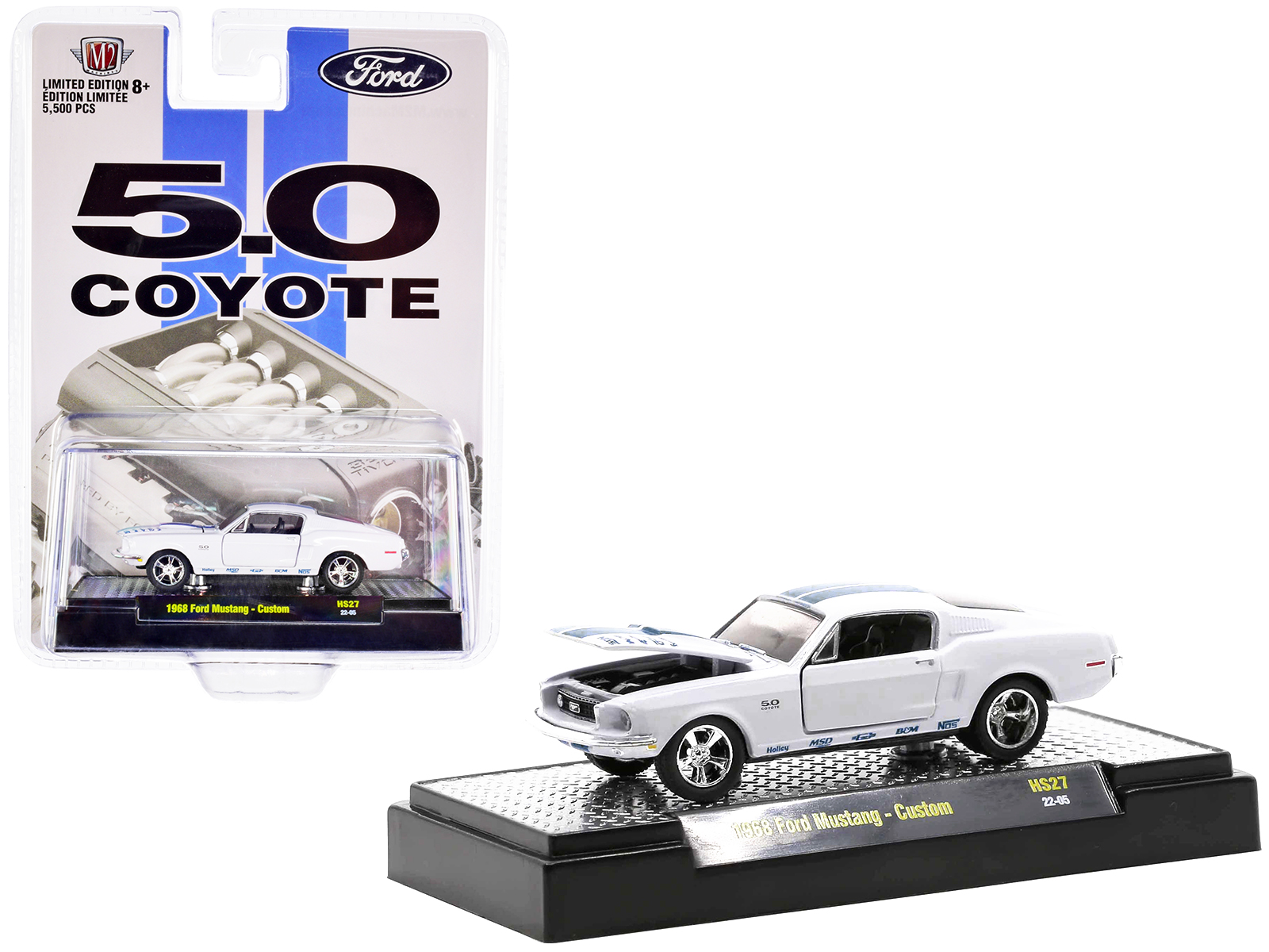 - Brand new 1/64 scale diecast car model of 1968 Ford Mustang Custom Platinum Pearl White with Blue Stripes “5.0 Coyote” Limited Edition to 5500 pieces Worldwide die cast model car by M2 Machines.