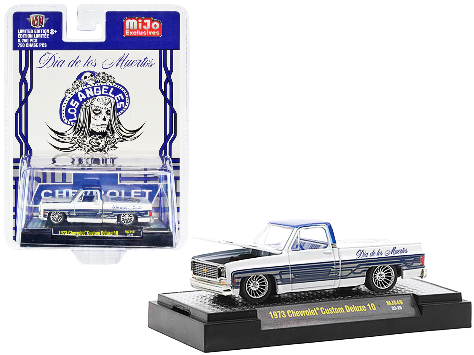 - Brand new 1/64 scale diecast car model of 1973 Chevrolet Custom Deluxe 10 Pickup Truck White Metallic with Graphics “Dia De Los Muertos – Los Angeles” (Day of the Dead) Limited Edition to 8250 pieces Worldwide die cast model car by M2 Machines.