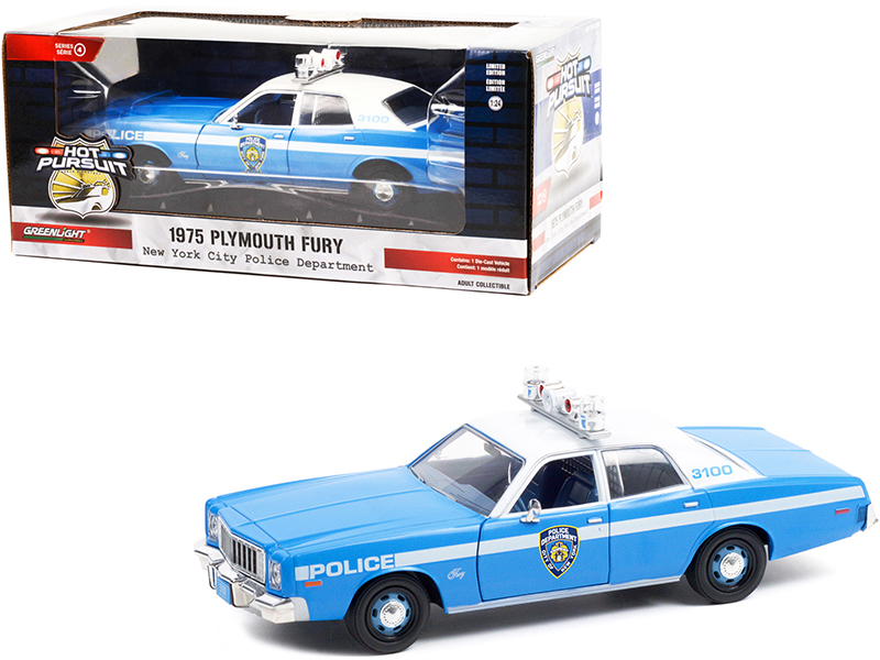 - Brand new 1/24 scale diecast car model of 1975 Plymouth Fury Light Blue with White Top “New York City Police Department” (NYPD) “Hot Pursuit” Series die cast model car by Greenlight.