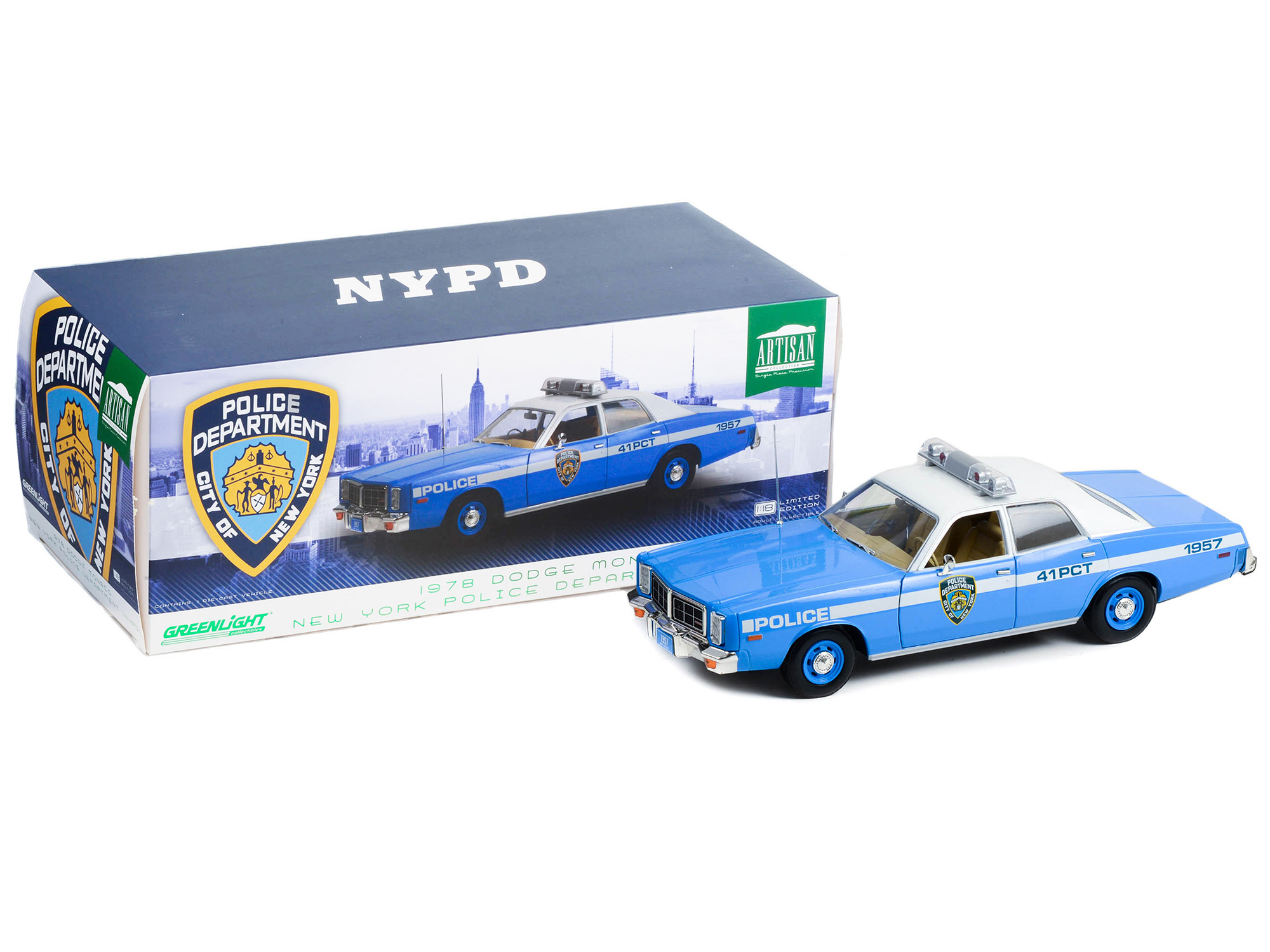 - Brand new 1/18 scale diecast car model of 1978 Dodge Monaco Police Blue and White NYPD (New York City Police Department) “Artisan Collection” die cast model car by Greenlight.