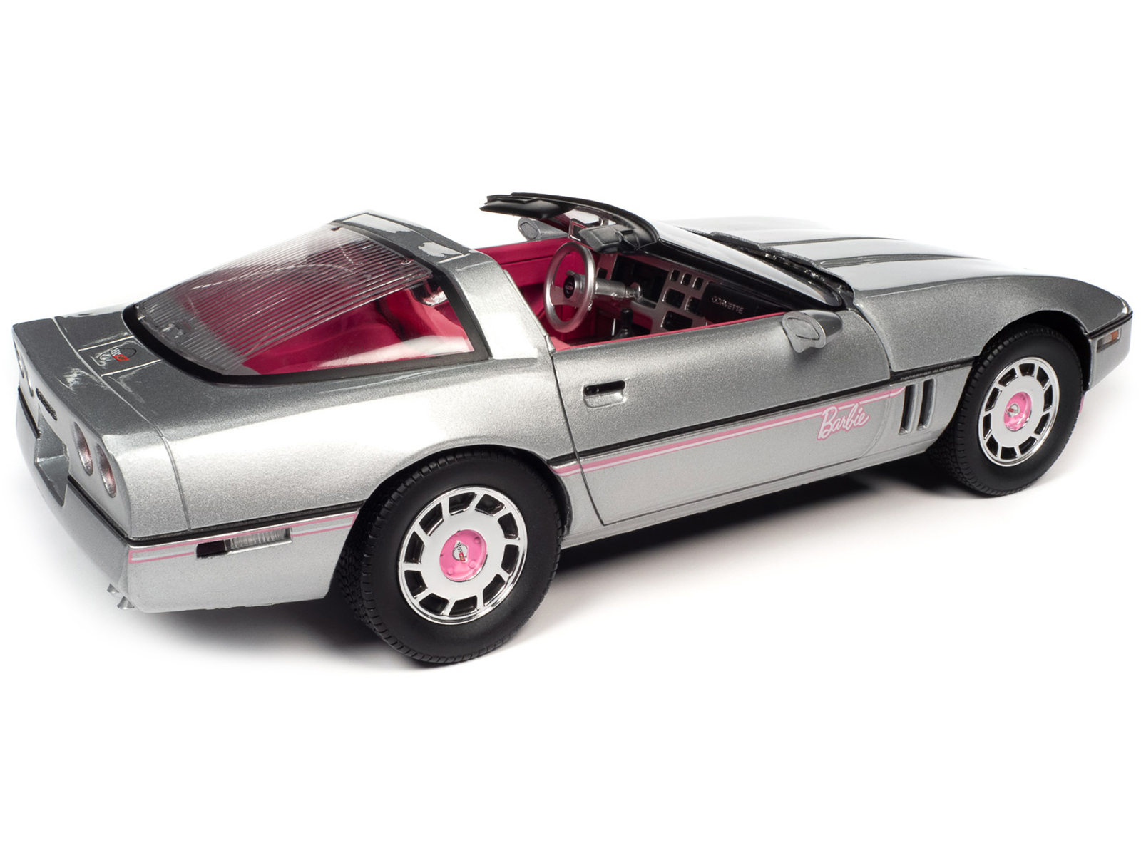 - Brand new 1/18 scale diecast car model of 1986 Chevrolet Corvette Convertible Silver Metallic with Pink Interior “Barbie” “Silver Screen Machines” die cast model car by Auto World.