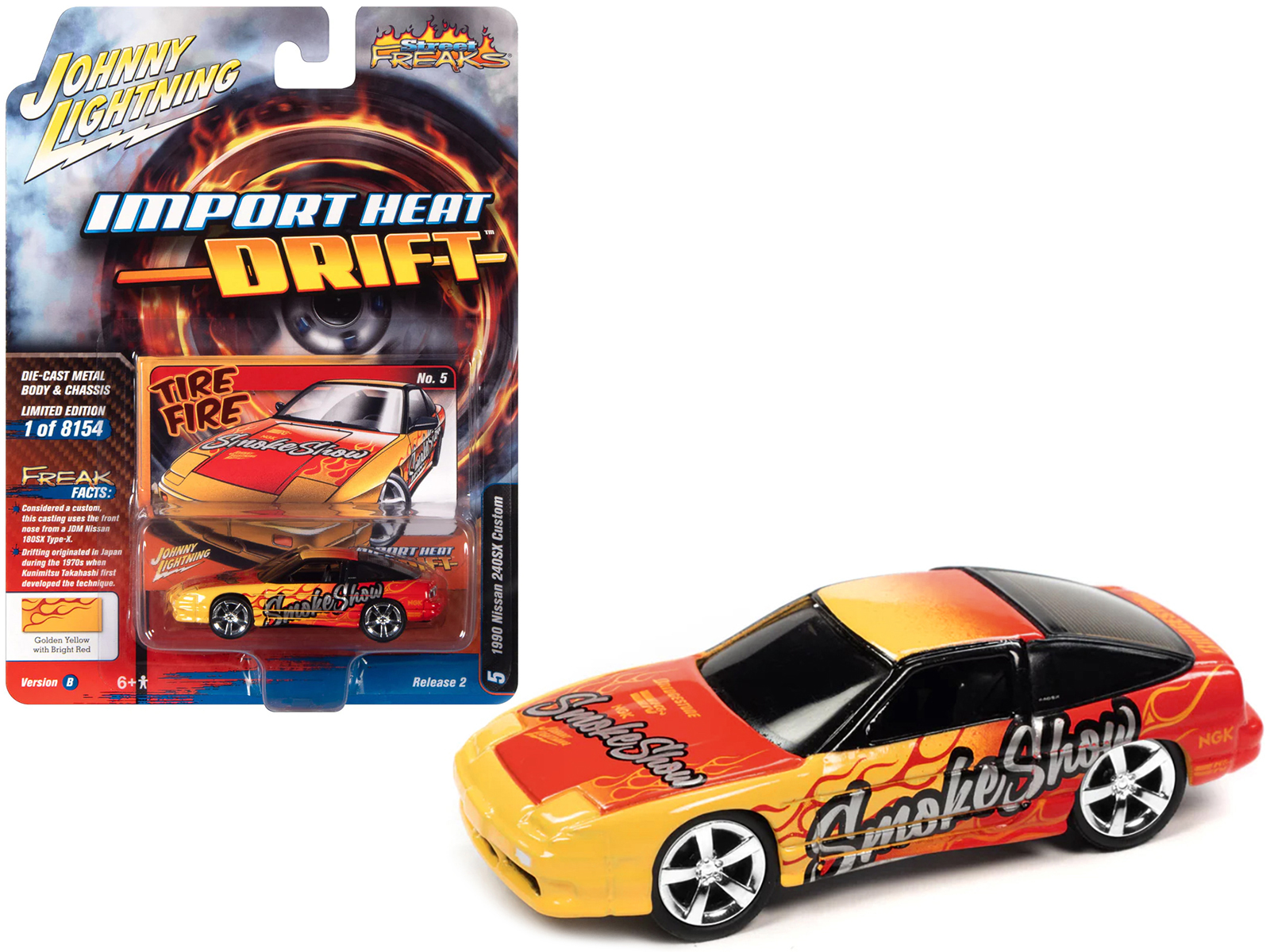 - Brand new 1/64 scale diecast car model of 1990 Nissan 240SX Custom Golden Yellow with Bright Red Flames “Smoke Show” “Import Hear Drift” Series Limited Edition to 8154 pieces Worldwide die cast model car by Johnny Lightning.