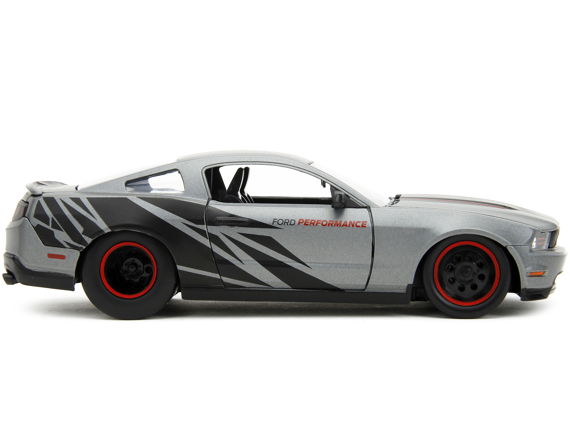 • Brand new 1/24 scale diecast car model of 2010 Ford Mustang GT Matt Gray Metallic with Black Graphics and Stripes “Ford Performance” “Bigtime Muscle” Series die cast model car by Jada.