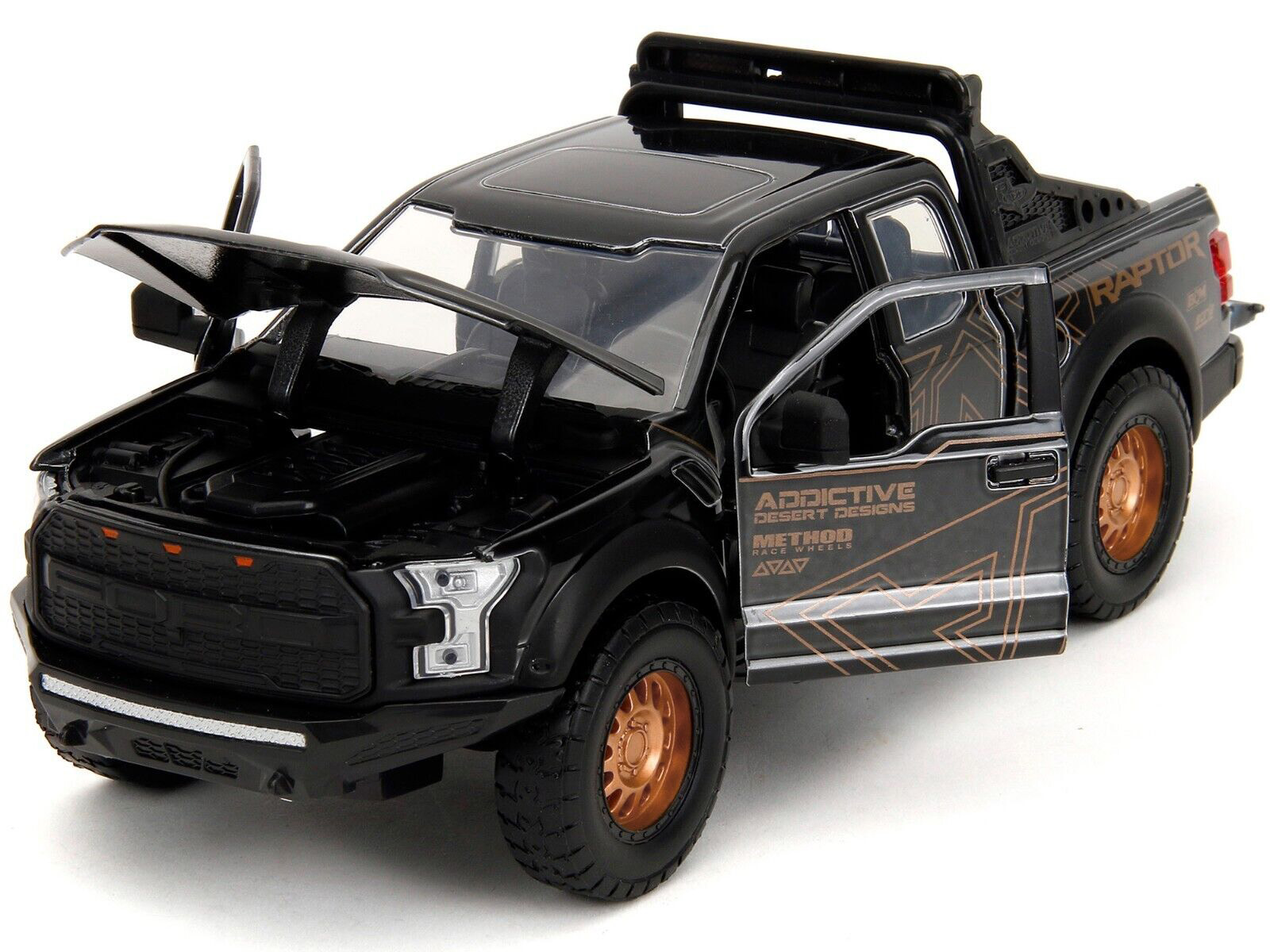• Brand new 1/24 scale diecast car model of 2017 Ford F-150 Raptor Pickup Truck Black with Gold Graphics “Pink Slips” Series die cast model car by Jada.