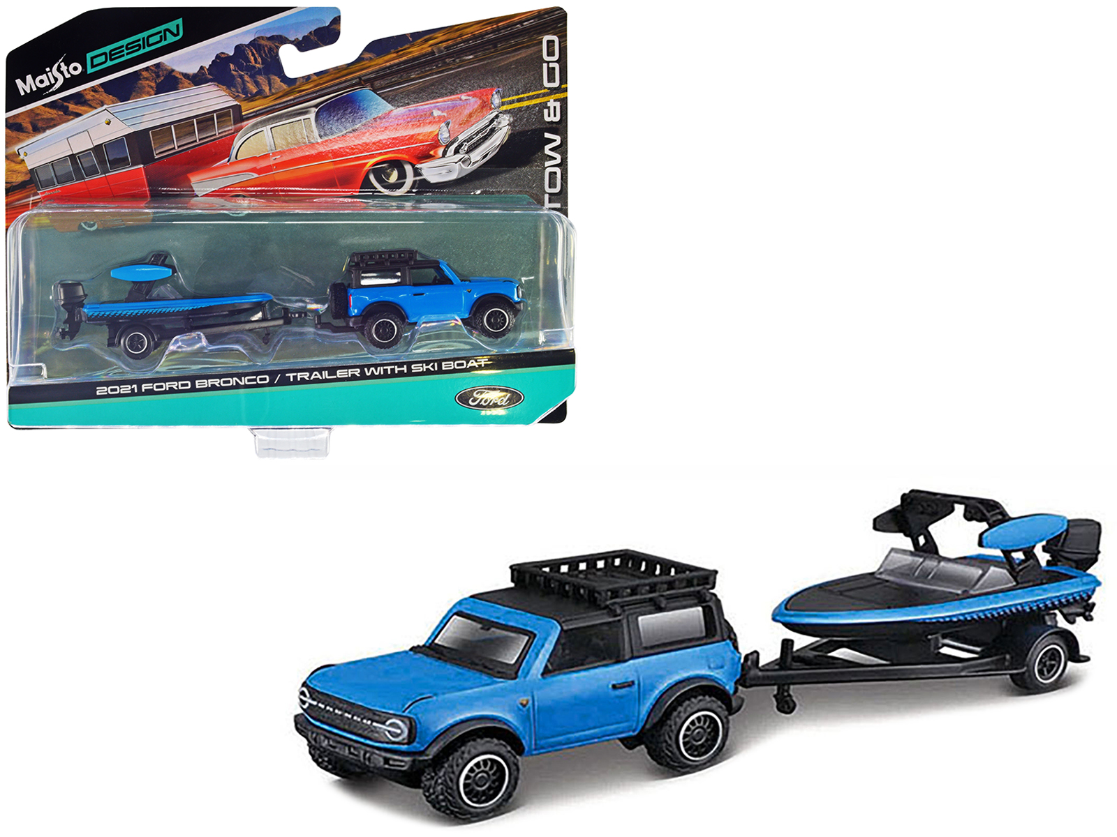 - Brand new 1/64 scale diecast car model of 2021 Ford Bronco Blue with Black Top and Roof Rack and Ski Boat with Trailer Blue and Black “Tow & Go” Series die cast model car by Maisto.