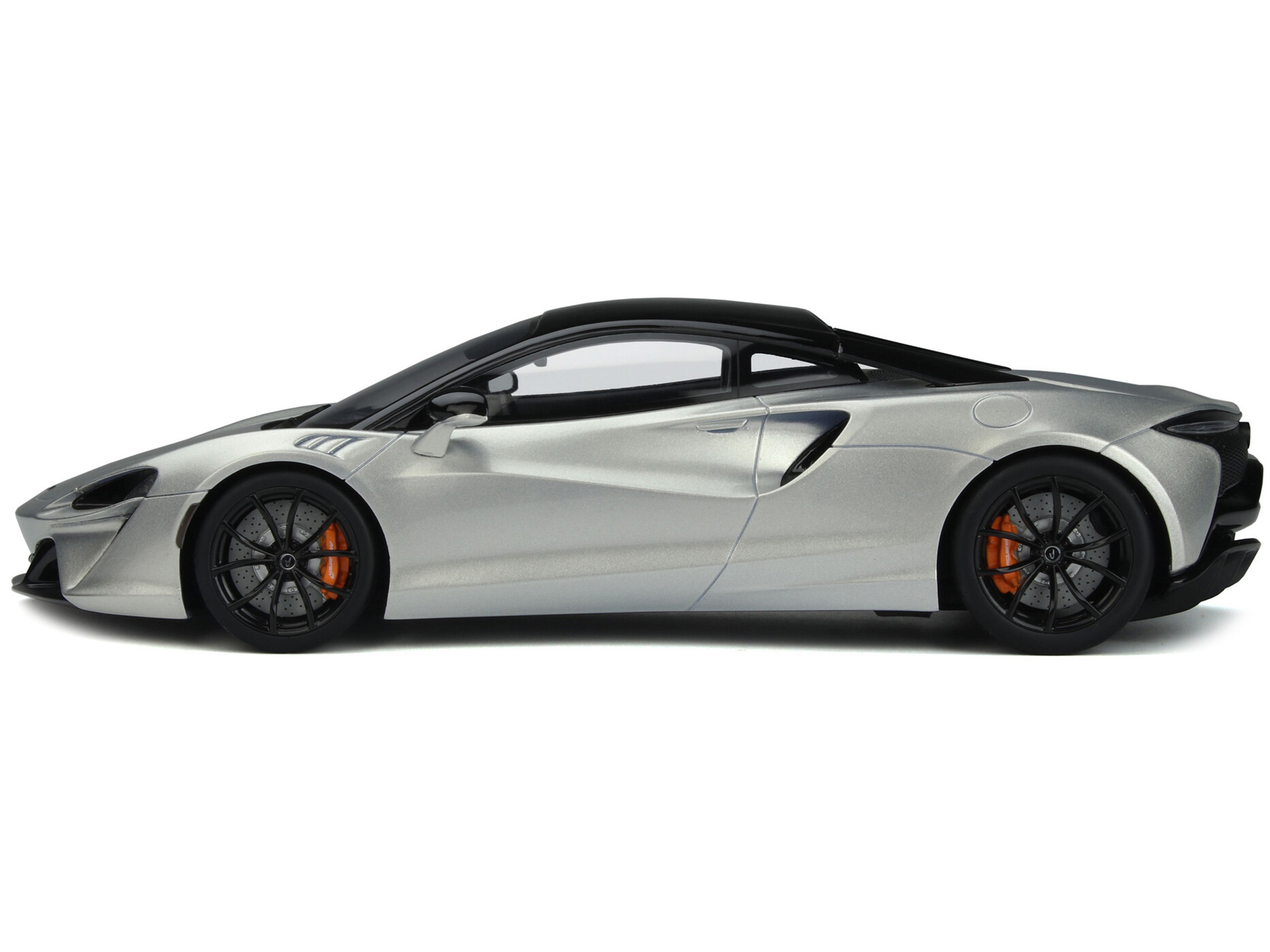 - Brand new 1/18 scale car model of 2021 McLaren Artura Silver Metallic with Black Top model car by GT Spirit.