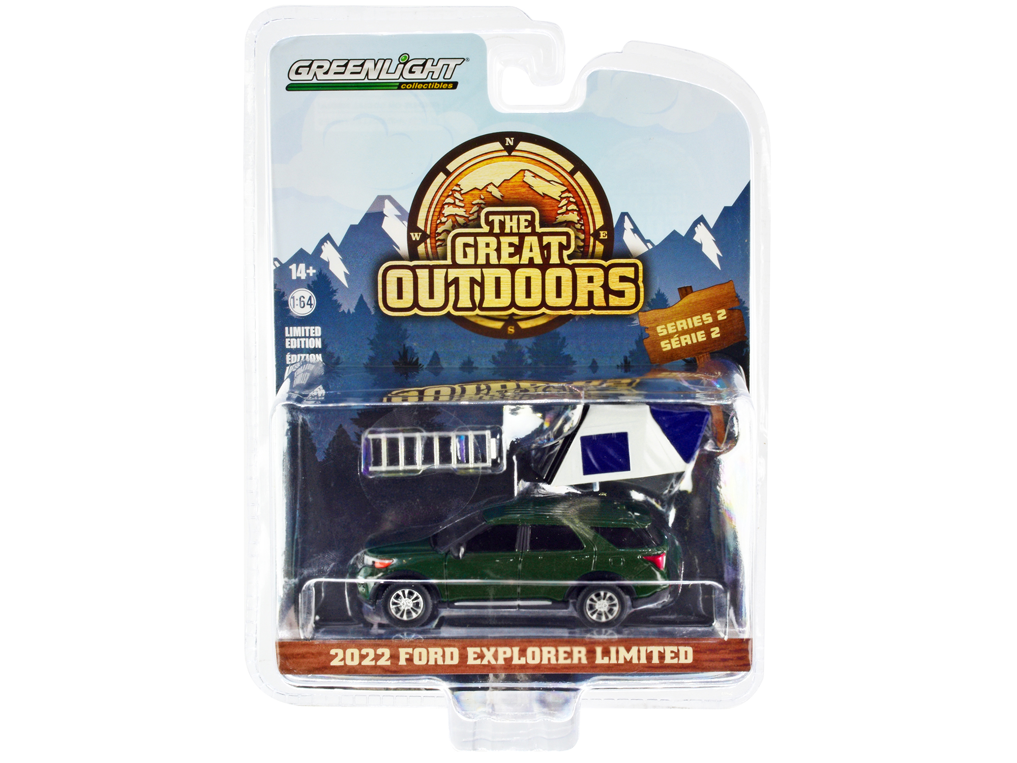 - Brand new 1/64 scale diecast model of 2022 Ford Explorer Limited Green Metallic with Modern Rooftop Tent “The Great Outdoors” Series 2 die cast model car by Greenlight.