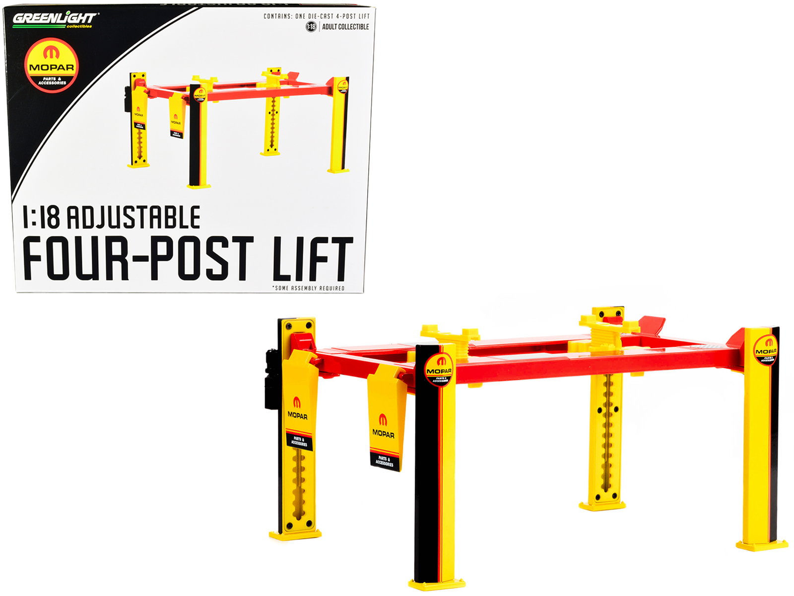 - Brand new 1/18 scale diecast model of Adjustable Four Post Lift “MOPAR” Black and Yellow for 1/18 scale model cars by Greenlight.