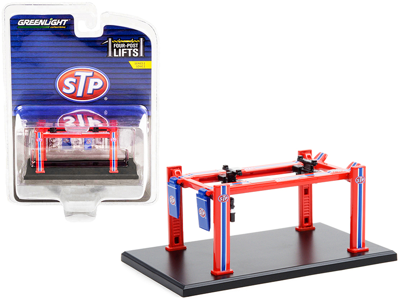 - Brand new 1/64 scale diecast model of Adjustable Four-Post Lift “STP” Red and Blue “Four-Post Lifts” Series 2 die cast model by Greenlight.