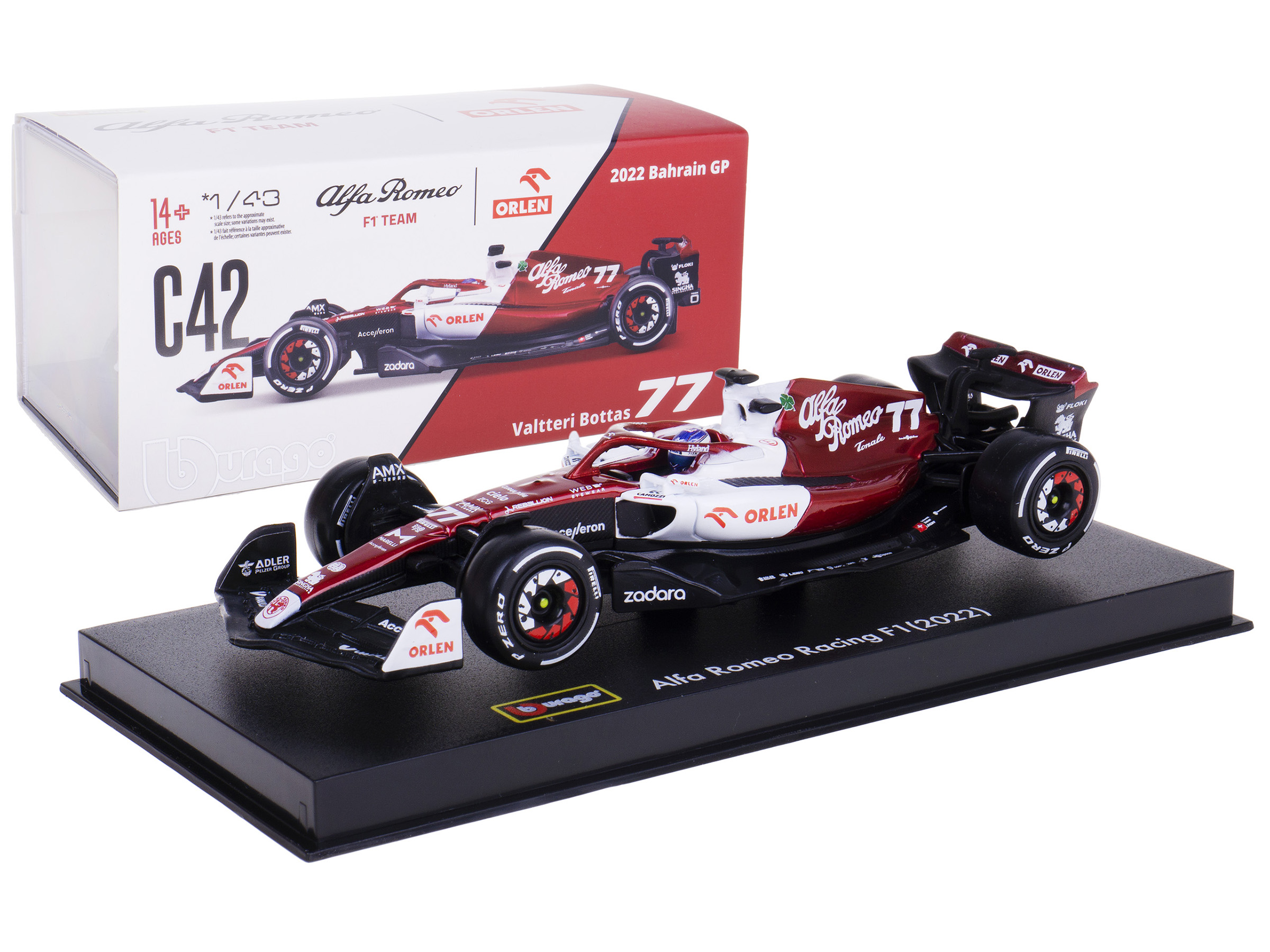 • Brand new 1/43 scale diecast car model of Alfa Romeo C42 #77 Valtteri Bottas F1 Formula One “Bahrain Grand Prix” (2022) with Display Case die cast model car by Bburago.