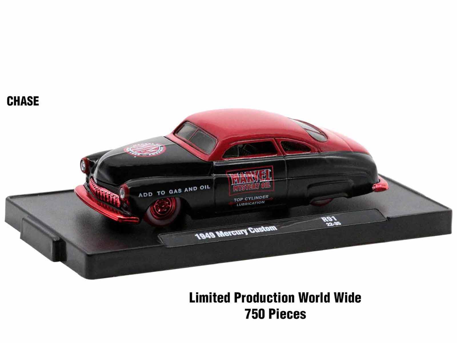 - CHASE CAR: 1949 Mercury Custom “Marvel Mystery Oil”. The Body is Semi-Gloss Black, The Top is Bright Red, The Interior is Red, The Seat Insert are Red, All Glass is Dark Tint A14. Since this is a Chase Car: All the Bumpers, Rims, Grill & Trim are Red Chrome, The Interior is Red, The Tires are Red. Limited Edition to 750 pieces Worldwide.