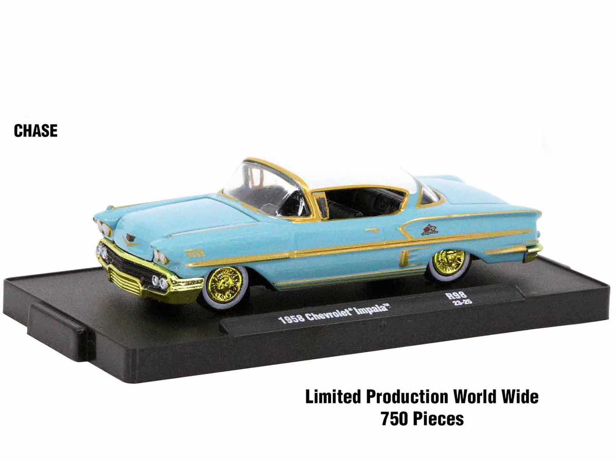 - CHASE CAR: 1958 Chevrolet Impala. The Body is Glen Green Metallic, The Top is Snow Crest White, The Bumpers, Grill, Trim & Rims are Chrome. Since this is a Chase Car: All the Tim, Bumpers are Rims are now Gold Chrome, Interior is Gold. Limited Edition to 750 pieces Worldwide.
