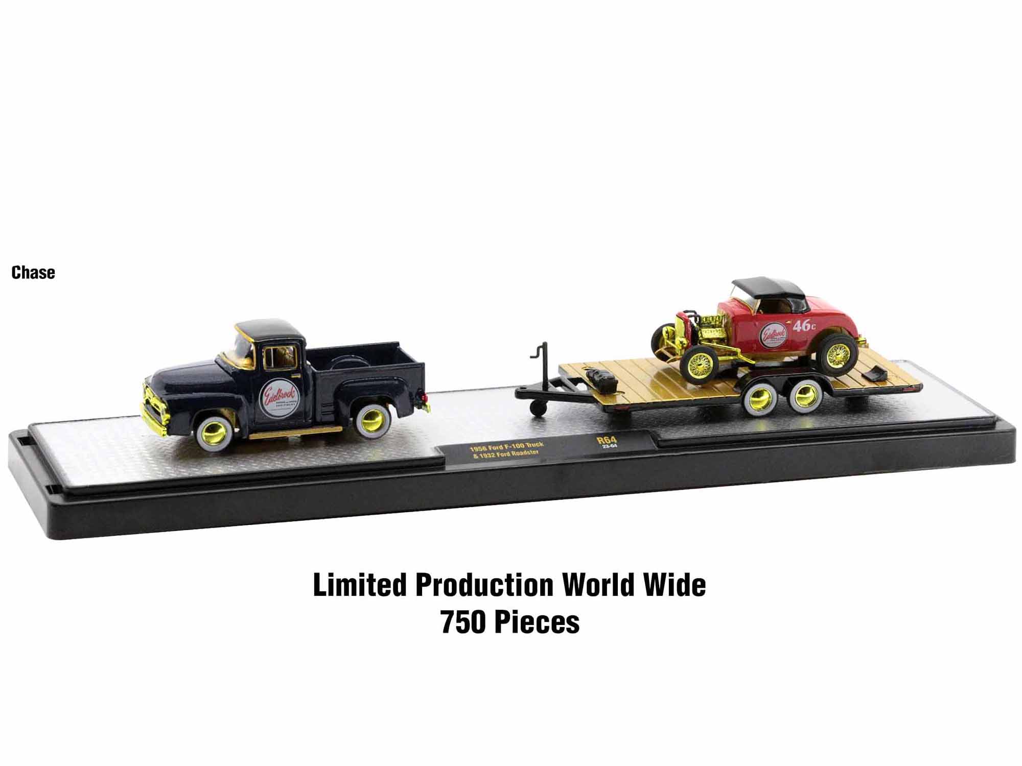 - CHASE MODELS: Chase Truck: 1958 Ford F100 Pickup Truck. The Body is Nocturne Blue Metallic, The Top is Gloss Black, The Bumpers, Fuel Tanks & Rims are Gold Chrome, The Interior is Gold, The Interior Insert is White, The Bumpers, Grill, Rims & Trim are Gold Chrome. Chase Car: 1932 Ford Roadster. The Body is Bright Poppy Red Gloss, The Chassis is Gold, The Top is Black, The Engine is Gold, The Interior is Gold, The Intake, Valve Covers, Headers, Headlights, Taillights are Gold Chrome. Since these are Chase Models: All the Trim, Bumpers, Rims are Gold Chrome, The Interior is Gold with Light Gold Inserts, The Chassis is Gold. Limited Edition to 750 pieces Worldwide.