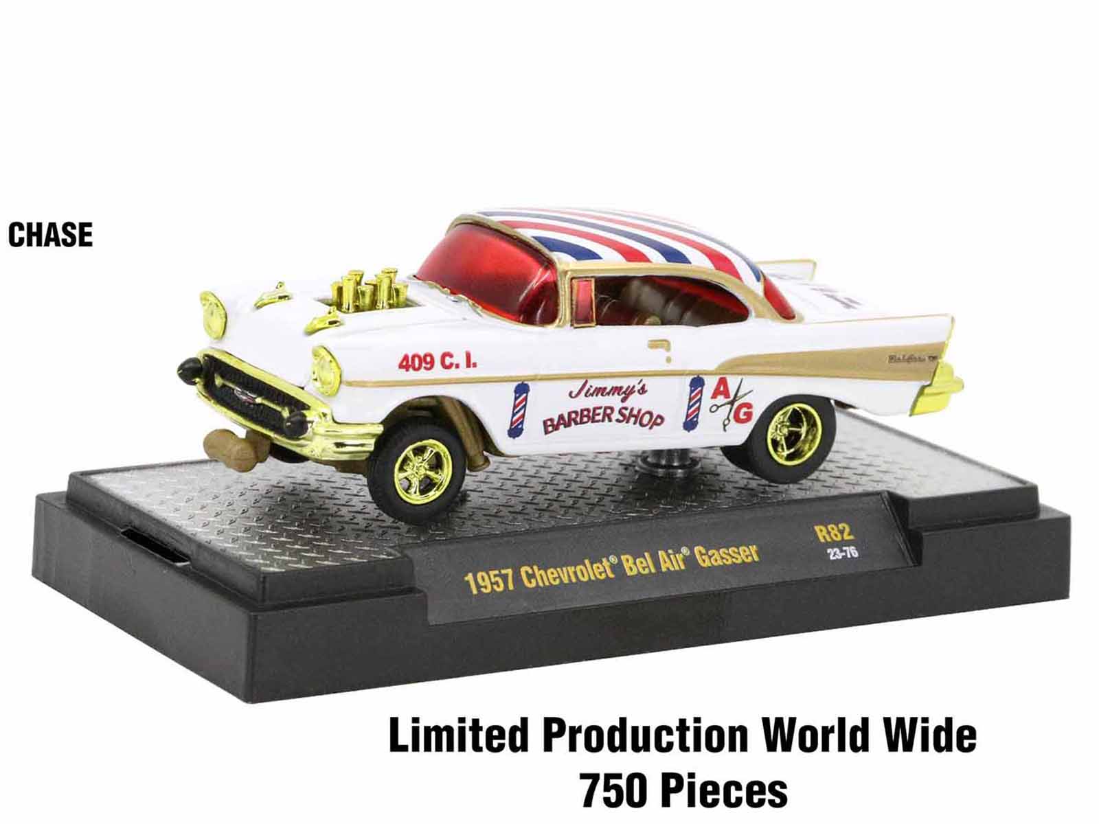- CHASE CAR: 1957 Chevrolet Bel Air Gasser. The Body is Pearl White, The Red Graphics are PMS 3621 C, The Blue Graphics are PMS 2767 C, The Interior is Gold, The Seat Insert are Blue, The Glass is Clear Red. Since this is a Chase Car: The Trim, Bumpers & Rims are now Gold Chrome, The Interior & Chassis is Now Gold. Limited Edition to 750 pieces Worldwide.