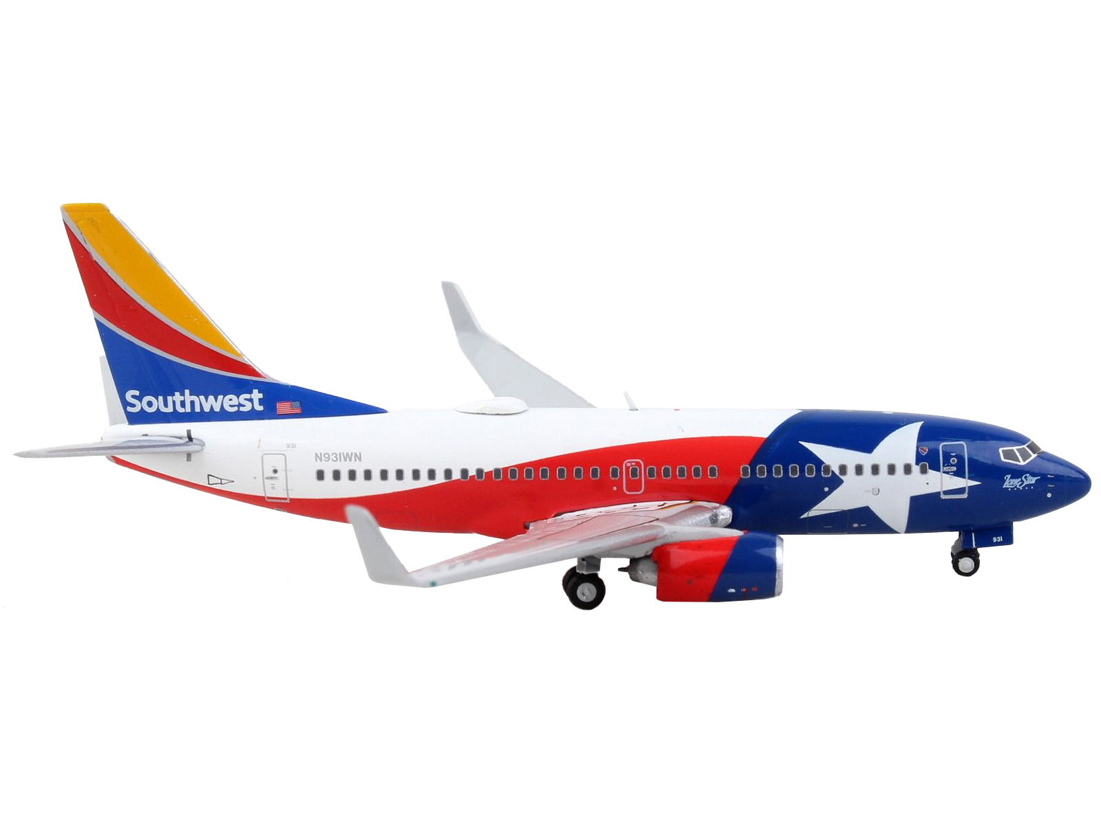 - HISTORY ASPECTS:The Southwest Airlines Boeing 737-700, proudly registered as N931WN, carries a remarkable legacy as “Lone Star One,” a unique and iconic livery that celebrates the vibrant state of Texas. This aircraft is more than just a plane; it’s a symbol of Texan pride and the spirit of Southwestern hospitality that Southwest Airlines is known for. The story of “Lone Star One” takes us on a journey through the heart of Texas, where friendly skies meet a Lone Star welcome.The livery of “Lone Star One” showcases the Texas state flag, with the iconic Lone Star boldly emblazoned on its tail, instantly capturing the attention of onlookers. This special livery is a tribute to the state’s rich cultural heritage and the importance of Texas within Southwest Airlines’ route network. It’s a flying testament to the airline’s commitment to making passengers feel right at home, even when they’re cruising at 30,000 feet. Whether you’re a Texan by birth or at heart, this aircraft symbolizes the warm and welcoming spirit of the Lone Star State.This beautifully detailed 1:400 scale model encapsulates the essence of Texas, Southwest Airlines, and the joy of flying. Display it with pride and remember the Texan charm of “Lone Star One” every time you gaze at this collectible piece. Don’t miss the chance to bring a touch of the Lone Star State into your aviation memorabilia collection with this finely crafted replica.