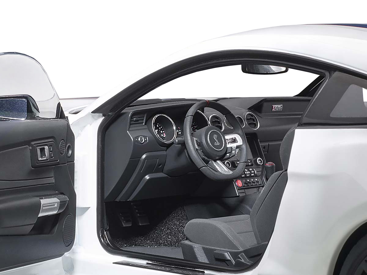 - Brand new 1/18 scale car model of Ford Mustang Shelby GT-350R Oxford White with Lightning Blue Stripes model car by Autoart.