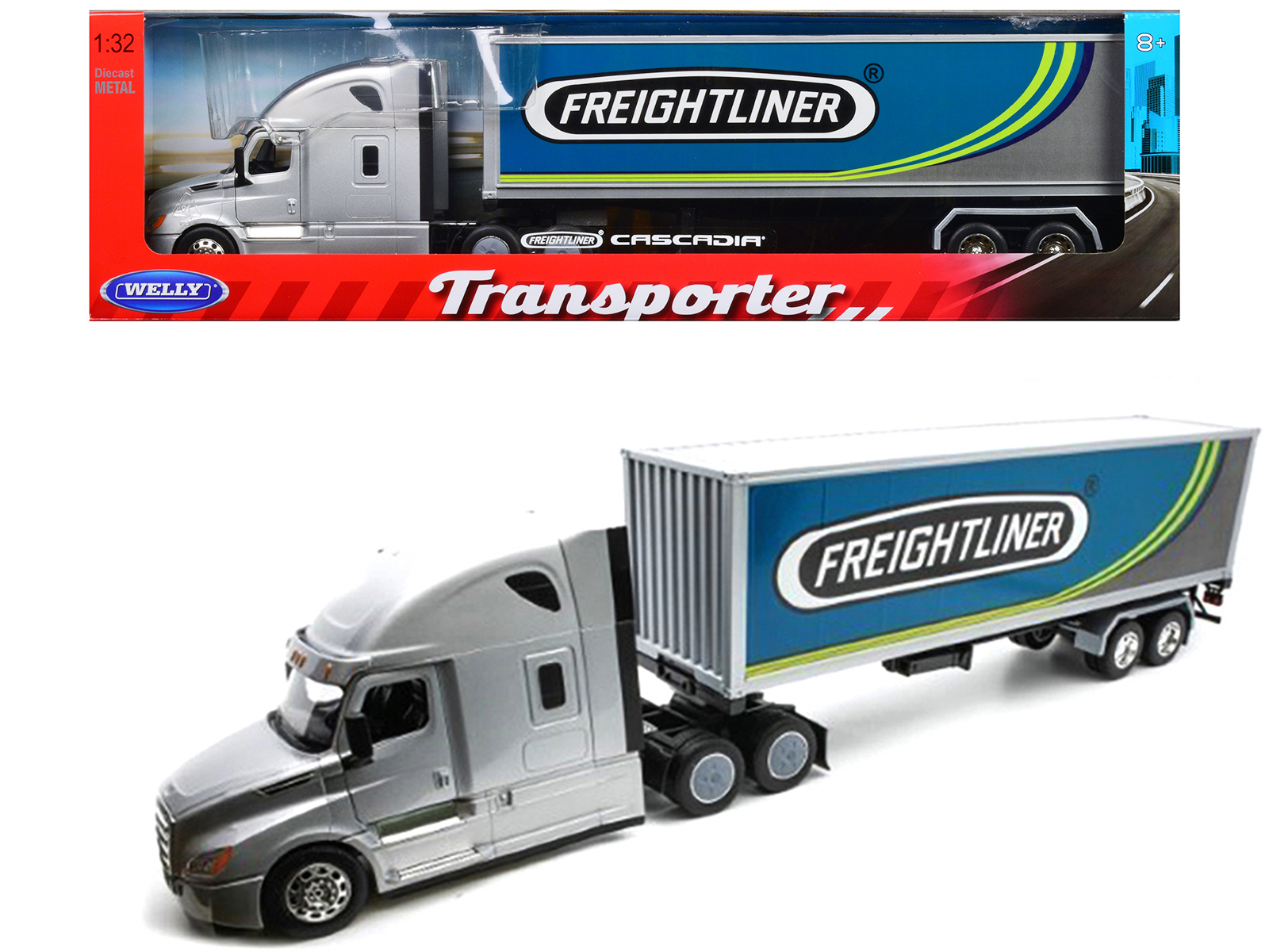 - Brand new 1/32 scale diecast model of Freightliner Cascadia Truck Silver Metallic with “Freightliner” Container die cast model by Welly.