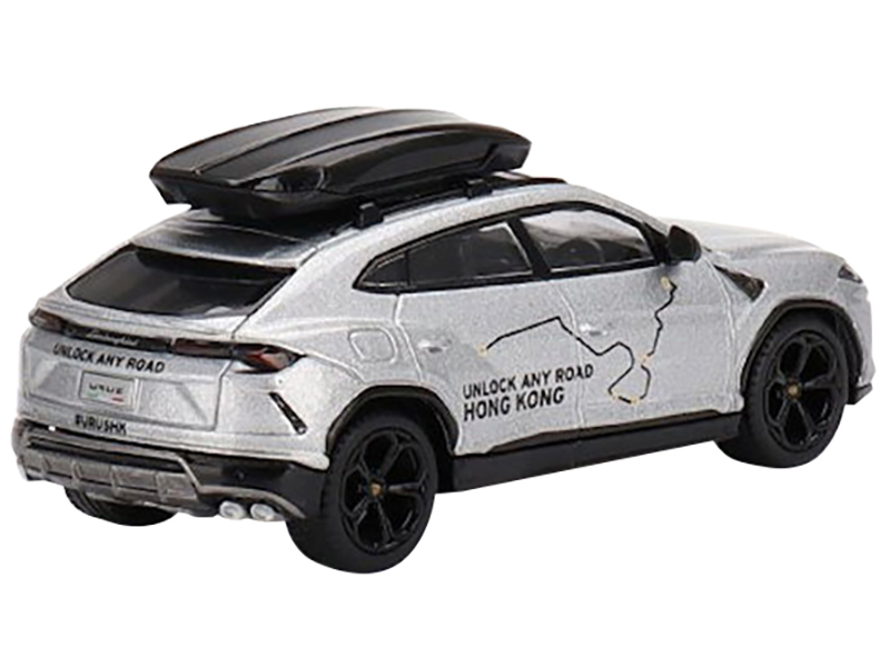 - Brand new 1/64 scale diecast car model of Lamborghini Urus with Roof Box “Unlock Any Road Hong Kong” Silver Metallic Limited Edition die cast model car by True Scale Miniatures.