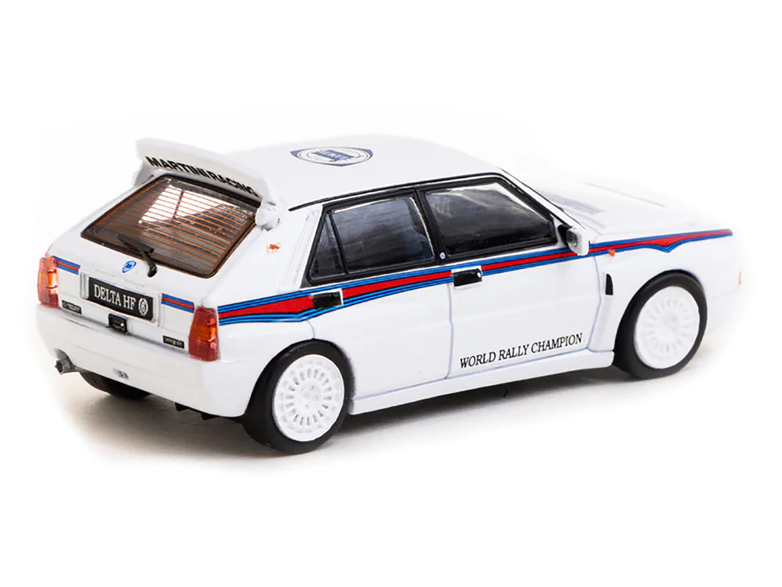 - Brand new 1/64 scale diecast model car of Lancia Delta HF Integrale White with Red and Blue Stripes “Martini 6 – World Rally Champion” “Road64” Series die cast model car by Tarmac Works.