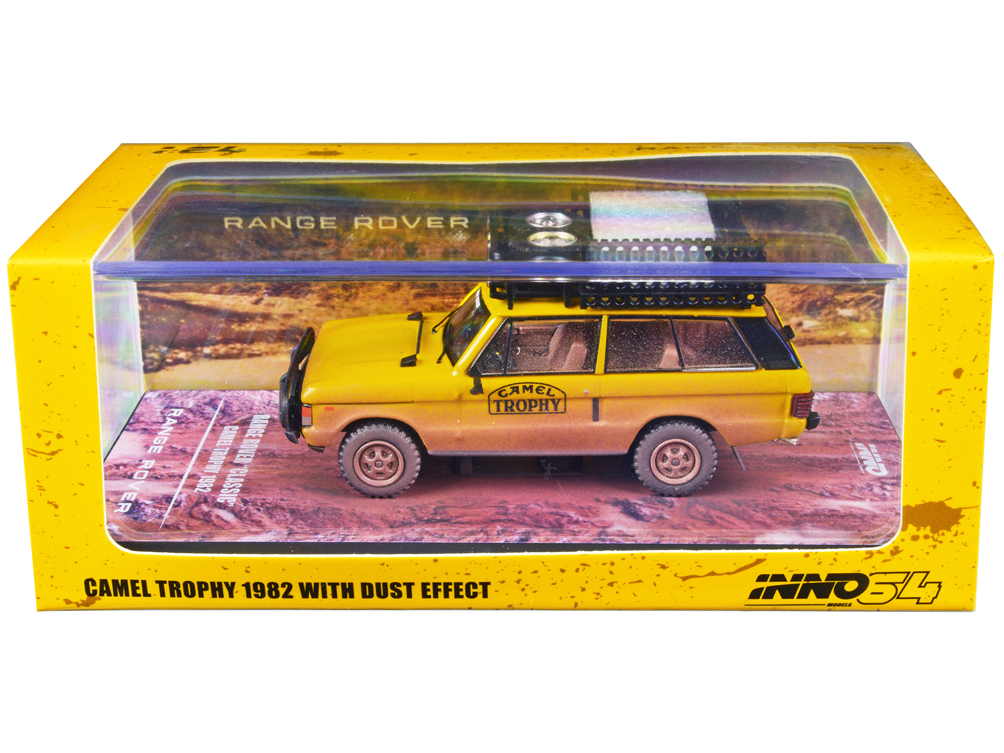 - Brand new 1/64 scale diecast car model of Land Rover Range Rover Classic “Camel Trophy 1982” Yellow (Dust Effect) with Roof Rack, Tool Box, and 4 Oil Container Accessories die cast model car by Inno Models.