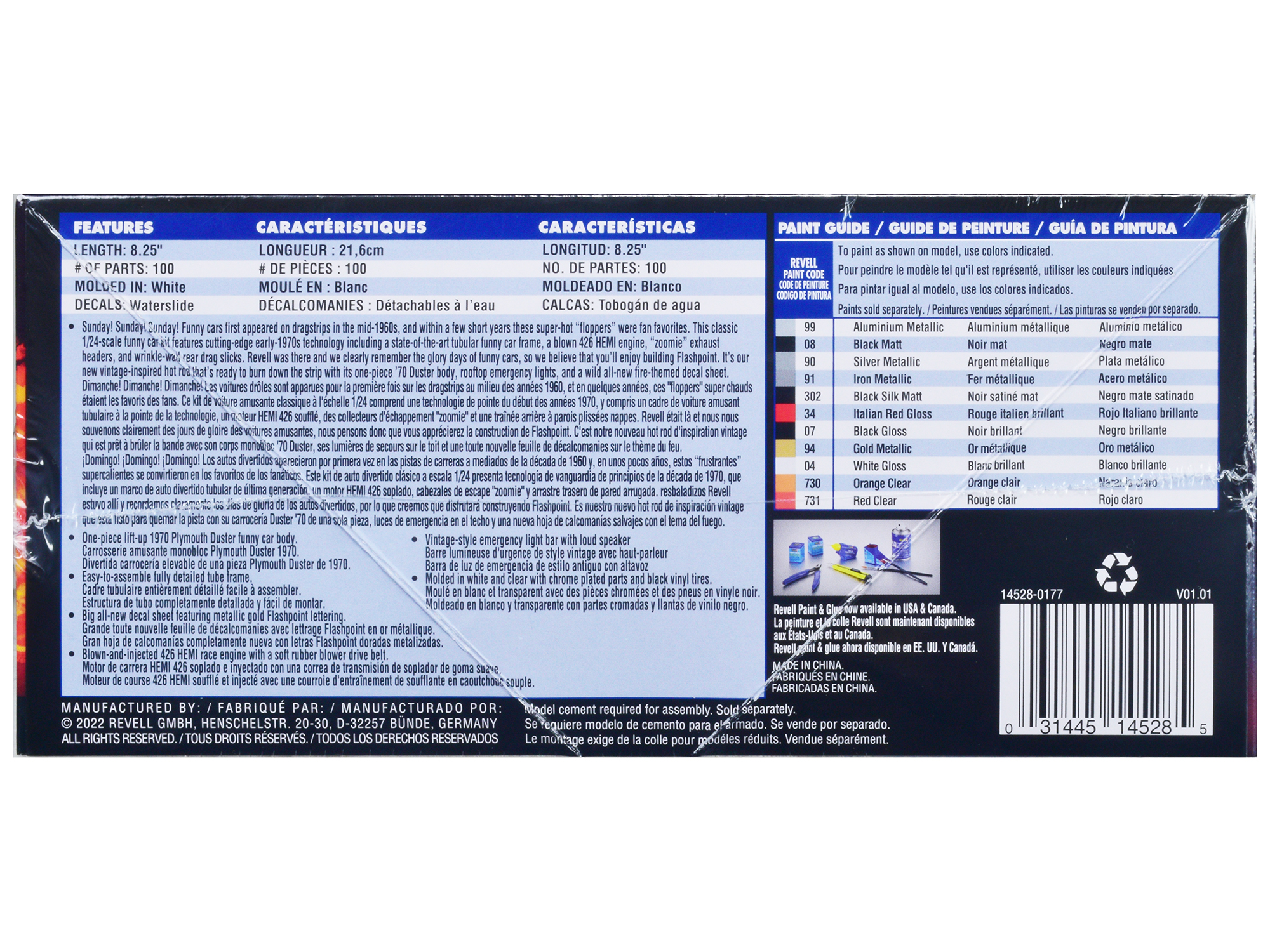 - Brand new plastic model kit of 1970 Plymouth Duster Funny Car (Level 4) 1/24 plastic model kit by Revell.