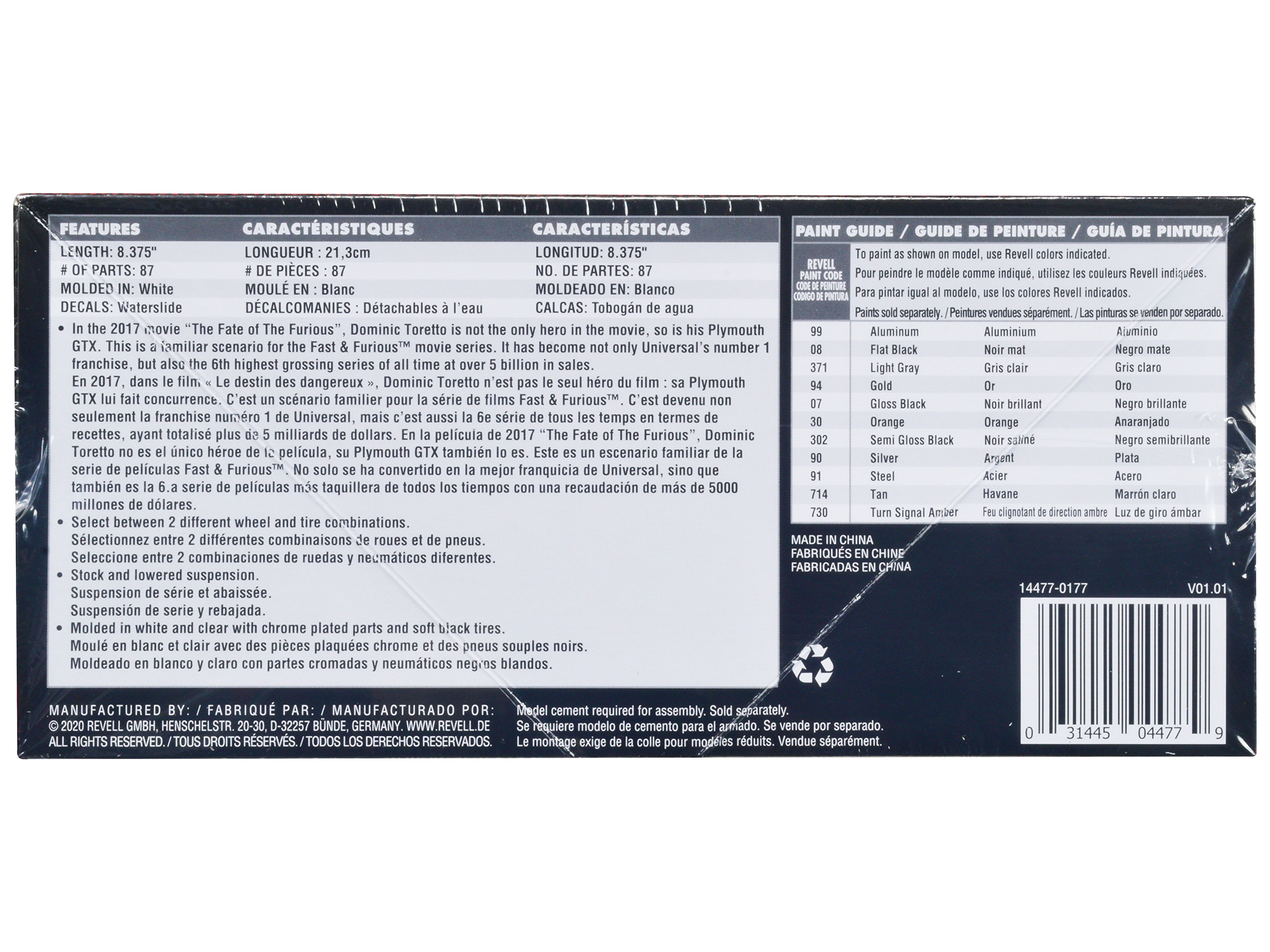 - Brand new plastic model kit of Dom’s 1971 Plymouth GTX “Fast & Furious” (Level 4) 1/24 plastic model kit by Revell.
