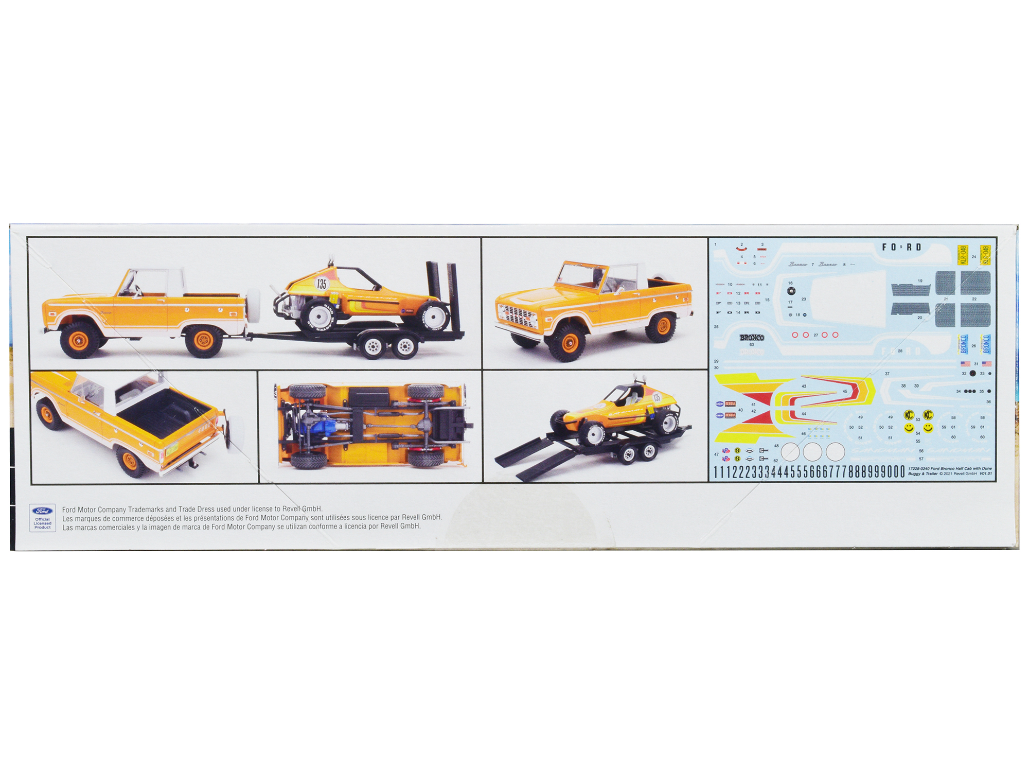 - Brand new plastic model kit of Ford Bronco Half Cab with Dune Buggy and Flatbed Trailer (Level 5) 1/25 plastic model kit by Revell.