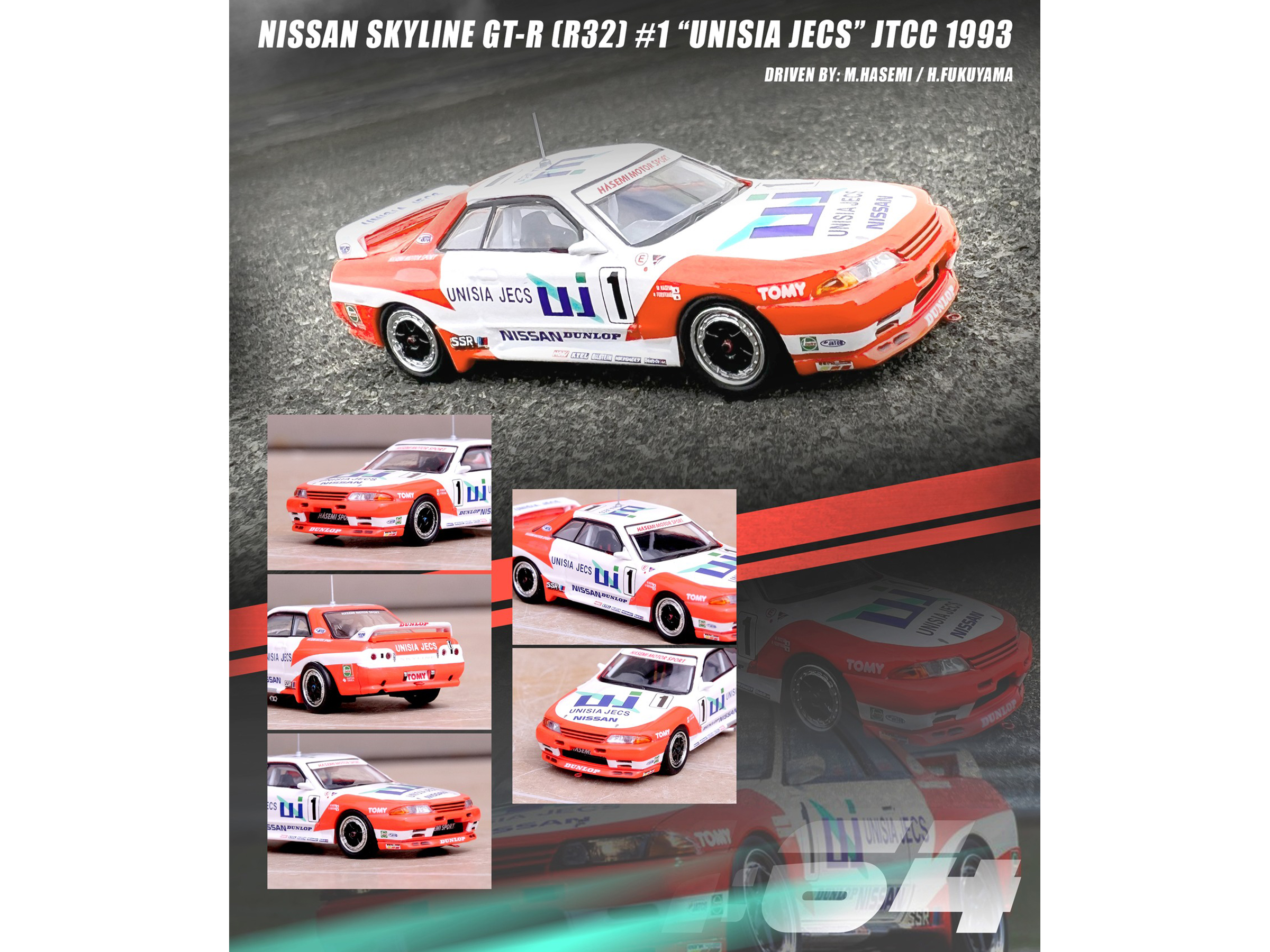 • Brand new 1/64 scale diecast car model of Nissan Skyline GT-R (R32) RHD (Right Hand Drive) #1 Masahiro Hasemi – Hideo Fukuyama “Unisia JECS” JTC (Japanese Touring Car Championship) (1993) die cast model car by Inno Models.