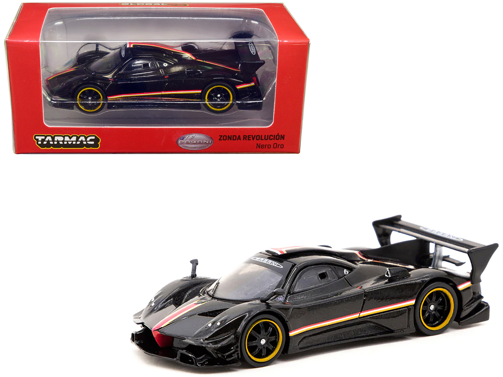- Brand new 1/64 scale diecast model of Pagani Zonda Revolucion Nero Oro Black Metallic with Stripes “Global64” Series die cast model by Tarmac Works.